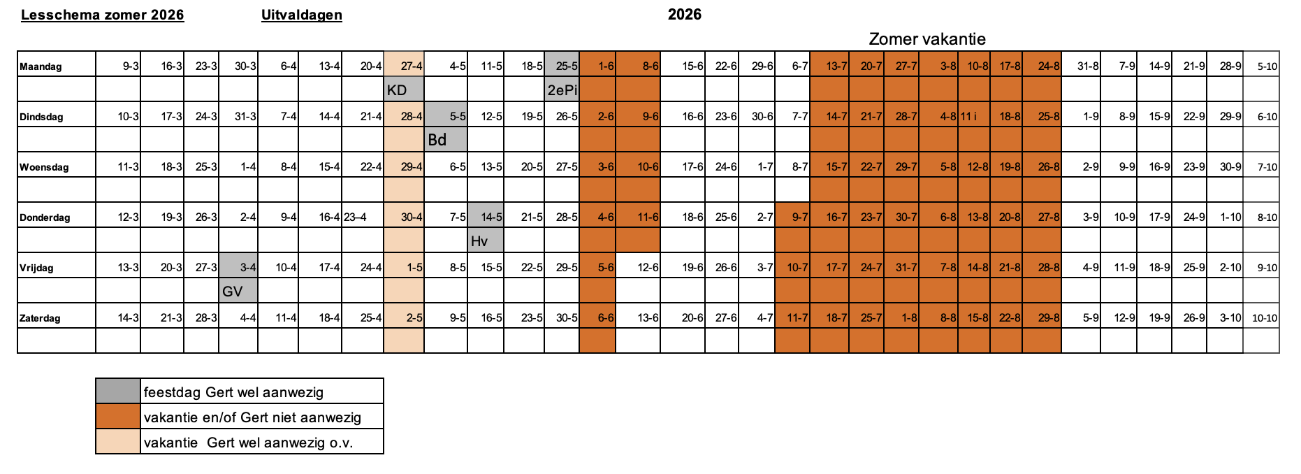 De trainingen beslaan 18 weken. Periode half maart tot eind september. 18 lesweken zijn gegarandeerd. In de meivakantie en de (basisschool) zomervakantie is er geen training. Zie ook “lesschema 2026” hieronder.